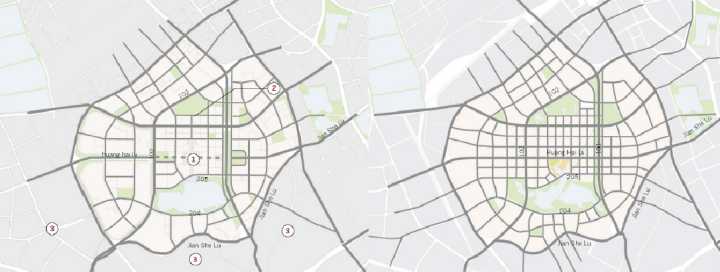 且不說標題的錯誤,街道和道路本來就是兩個意思,而其實他想表達的意思是道路。切割城市的道路也要看區(qū)域,看尺度,一味否定絕對不是正確的觀點。而這樣的思考,多少年前,城市設計的實踐領域也早已出現(xiàn)。何況道路和人其實不是對立的(下圖來自[SOM][2008]武漢王家墩商務核心區(qū)設計規(guī)劃方案,比較城市設計前后的路網密度)