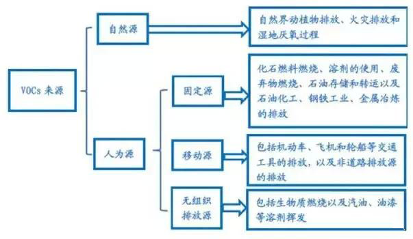 VOCs的排放來(lái)源分為自然源和人為源。全球尺度上,VOCs 排放以自然源為主;但對(duì)于重點(diǎn)區(qū)域和城市來(lái)說(shuō),人為源排放量遠(yuǎn)高于自然源,是自然源的6-18倍。
