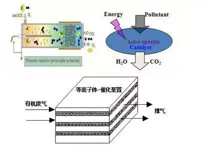 原理:等離子體場(chǎng)富集大量活性物種,如離子、電子、激發(fā)態(tài)的原子、分子及自由基等;活性物種將污染物分子離解小分子物質(zhì)。