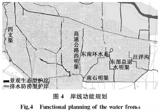 石家莊市明渠以排澇功能為主,兼顧景觀休閑功能,參照《地表水環境質量標準》,主要以人體非直接接觸的娛樂用水區和一般景觀要求水域為主。結合河道功能布局,確定不同斷面水質標準在Ⅳ類或Ⅴ類。其中景觀生態型岸線是重要的親水活動空間,需確保Ⅳ類水質要求,岸線功能規劃見圖4。