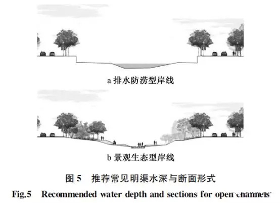 綜合考慮以上因素,結合不同區域渠道斷面以及功能定位,除東南環水系外,確定渠道水深控制在0.5 m以內。同時根據現有梯形斷面的深度情況,控制水深基本維持在0.3 m左右。推薦常見明渠水深與斷面形式見圖5。
