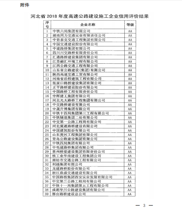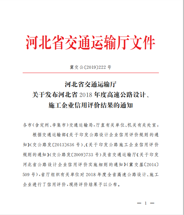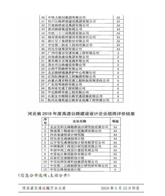 河北省交通運輸廳關于發布河北省2018年度高速公路設計、施工企業信用評價結果的通知