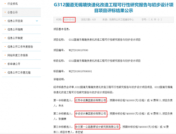 今年3月1日,無錫市城市重點項目管理中心發(fā)布的《G312國道無錫境快速化改造工程可行性研究報告與初步設計項目項目評標結(jié)果公示》顯示,該項目標段的第一中標候選人為中設股份,第二中標候選人為中設集團,第三中標候選人為中交第一公路勘察設計研究院有限公司。