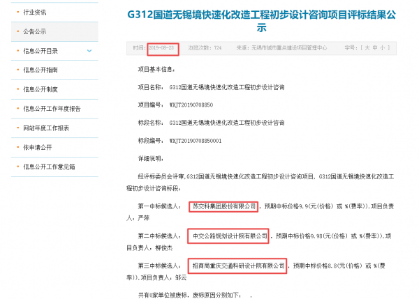 此外,無錫市城市重點項目管理中心于今年8月23日發(fā)布的《G312國道無錫境快速化改造工程初步設計咨詢項目評標結(jié)果公示》顯示,該項目標段的第一中標候選人為蘇交科、第二中標候選人為中交公路規(guī)劃設計院有限公司、第三中標候選人為招商局重慶科研設計研究院有限公司。