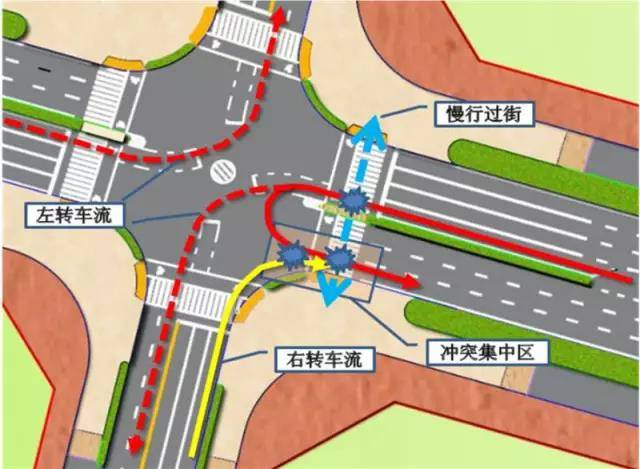 特征分析:只能在左轉相位允許時使用,占用交叉口展寬資源,不易行人過街沖突,易與右轉車干擾。