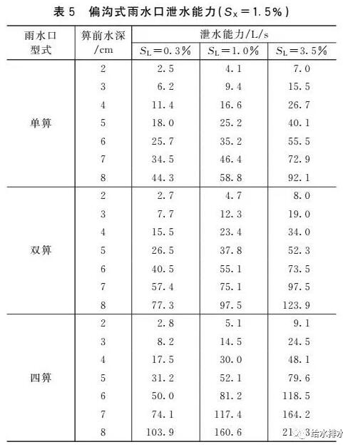 國家標準圖集《雨水口》(16S518)提供了一個在一定水力條件下(道路縱坡0.3%~3.5%,橫坡1.5%,箅前水深40 mm)通過1∶1的水工模型經過試驗確定的不同型式雨水口泄水能力,如表3所示。