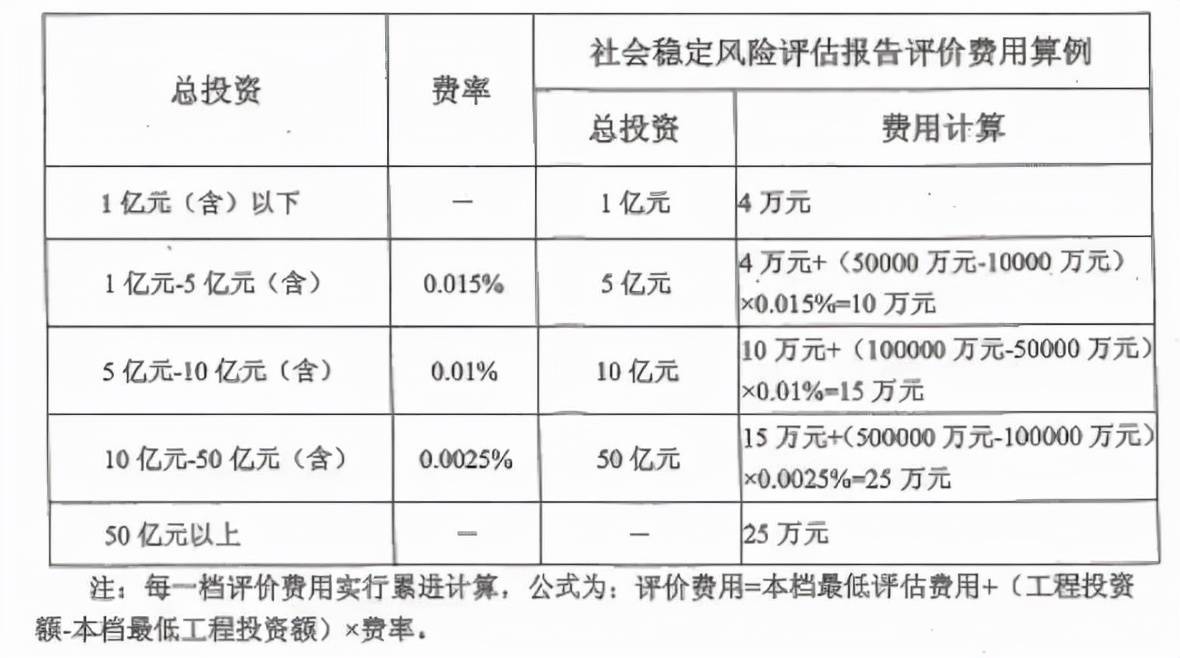 上述兩份文件給出“編制建設(shè)項(xiàng)目社會(huì)穩(wěn)定風(fēng)險(xiǎn)評(píng)估報(bào)告的基準(zhǔn)收費(fèi)標(biāo)準(zhǔn)”、“評(píng)價(jià)建設(shè)項(xiàng)目社會(huì)穩(wěn)定風(fēng)險(xiǎn)評(píng)估報(bào)告的基準(zhǔn)收費(fèi)標(biāo)準(zhǔn)”和三種“分檔收費(fèi)調(diào)整系數(shù)”,其中: