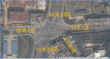 該交叉口位于江西省南昌市新建區中心城區西部。由長堎大道、紅灣大道、文化大道、興國路五路交叉組成。其中長堎大道南北方向雙向六車道主干道,紅灣大道、文化大道是連接新建區和灣里區的主要交通干道,興國路連接新建區中心城區并設有多條公交線路。該交叉處在新建區大力開發地段,周邊居民區密集、各道路沿途設有多家商業和購物中心,并輻射周邊的高校園區和工業園區。由于交叉口交通流量較大、多路相交,加上長堎大道建成通車后未能對交叉口各進出口道和內部空間進行科學合理的交通渠化設計,導致交通混行,交通擁堵現象經常發生。交叉口現狀如圖-1所示。