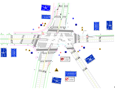 交叉口內部區域采用導流線、行人過街安全島以及交通流向標志標識等進行渠劃設計。