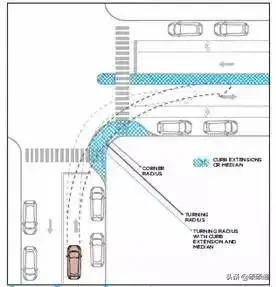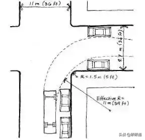 《美國城市街道設(shè)計手冊》規(guī)定,常規(guī)城市道路交叉口轉(zhuǎn)彎半徑是3~4.5米(10~15英尺),且在很多城市,轉(zhuǎn)彎半徑用了非常小的0.6米(2英尺),大于4.5米的轉(zhuǎn)彎半徑只會在極特殊情況下才會采用。