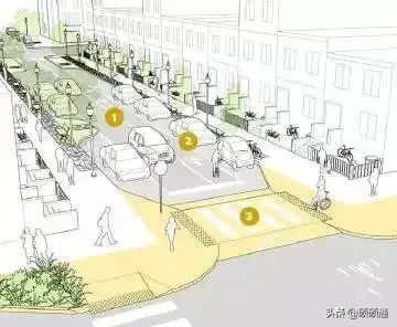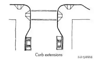 此外,在居住區(qū)或是有路側(cè)停車的城市支路,可將交叉口進(jìn)行縮窄設(shè)計,以減小行人過街距離,進(jìn)一步降低車輛轉(zhuǎn)彎速度、保障行人安全。