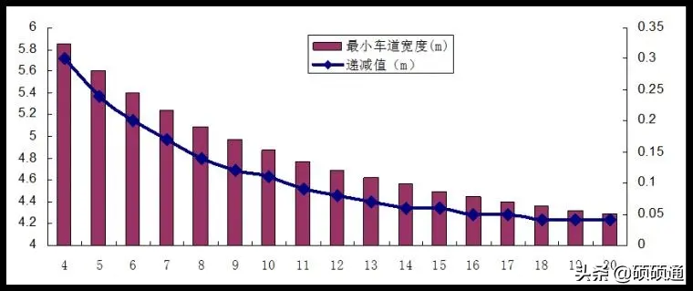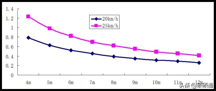 車輛轉(zhuǎn)彎有輪差,所以轉(zhuǎn)彎車道寬度要求一般稍大。以常規(guī)大巴公交車行駛為例,橫向側(cè)距取0.5米,則可以計算得出車道寬度和轉(zhuǎn)彎半徑的對應(yīng)關(guān)系圖如下。