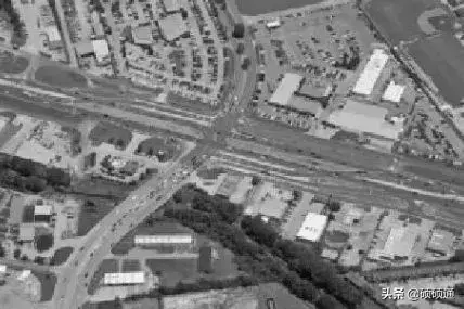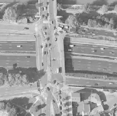 2000 年Jonathan Reid 提出一種新型交叉口設(shè)計方案,即扇形交叉口(Quadrant Roadway Intersection)。其設(shè)計思想是主交叉口禁止左轉(zhuǎn),利用十字交叉口某象限內(nèi)的連接通道組織車輛左轉(zhuǎn),簡化主交叉口信號相位,從而提高交叉口運行效率,改善主交叉口的擁堵狀況。美國某城市的扇形交叉口實景圖: