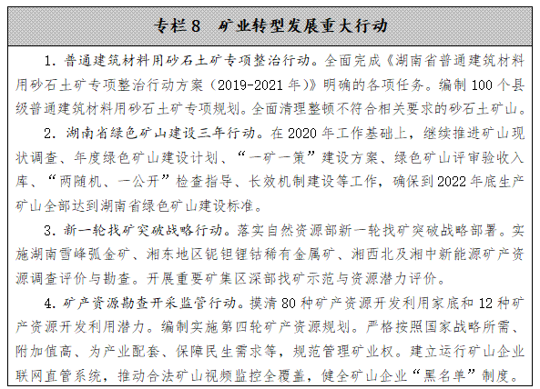 合理設(shè)置礦業(yè)權(quán)。全面實(shí)行礦業(yè)管理、生態(tài)修復(fù)“雙負(fù)責(zé)”制度,逐礦落實(shí)規(guī)劃和項(xiàng)目環(huán)評、排污許可制度,統(tǒng)籌用礦、用地、用林審批。規(guī)范財(cái)政出資勘查項(xiàng)目管理,嚴(yán)格控制投放商業(yè)性探礦權(quán),地質(zhì)勘查重點(diǎn)轉(zhuǎn)向民生所需礦產(chǎn)、新興能源和戰(zhàn)略性礦產(chǎn),以及水文地質(zhì)、工程地質(zhì)、環(huán)境地質(zhì)等工作領(lǐng)域。優(yōu)化采礦權(quán)結(jié)構(gòu),除國家戰(zhàn)略礦種、附加值高、為產(chǎn)業(yè)配套以及保障民生需求情形外,不再新設(shè)采礦權(quán),規(guī)范已設(shè)采礦權(quán)延續(xù),加快淘汰落后產(chǎn)能,到2025年底全省采礦權(quán)數(shù)量控制在3000宗以內(nèi),其中砂石土礦采礦權(quán)數(shù)量不超過1500宗。