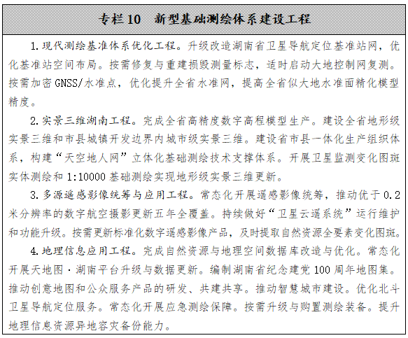 推進(jìn)新型基礎(chǔ)測繪體系建設(shè)。在做好全省1:10000地形圖和市縣城鎮(zhèn)開發(fā)邊界內(nèi)1:500地形圖生產(chǎn)更新的基礎(chǔ)上,以“滿足要求、貼近需求”為導(dǎo)向,推進(jìn)新型基礎(chǔ)測繪體系和實(shí)景三維湖南工程建設(shè),建立以實(shí)景三維湖南為核心的新型基礎(chǔ)測繪產(chǎn)品體系,帶動生產(chǎn)組織體系、標(biāo)準(zhǔn)政策體系、技術(shù)支撐體系和應(yīng)用服務(wù)體系的全面重構(gòu)。按照“試點(diǎn)驗(yàn)證、按需精化、以用促建、省市聯(lián)動”的思路,基本建成覆蓋全面、更新及時(shí)、管控精準(zhǔn)、立體直觀、承載力強(qiáng)的實(shí)景三維湖南和省級統(tǒng)籌、聯(lián)動更新、開放共享、按需服務(wù)的湖南省新型基礎(chǔ)測繪體系。