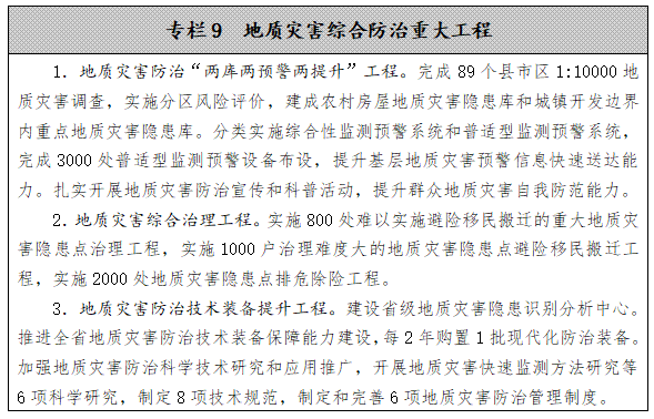 實(shí)施地質(zhì)災(zāi)害技防建設(shè)工程。推進(jìn)省市縣三級地質(zhì)災(zāi)害防治技術(shù)裝備保障能力建設(shè),配置空天地一體化數(shù)據(jù)采集、傳輸、通訊、指揮等防治現(xiàn)代化專業(yè)裝備,提升地質(zhì)災(zāi)害防治信息獲取、通信保障、數(shù)據(jù)分析和技術(shù)支撐能力。為群測群防員配備升級基礎(chǔ)性裝備。